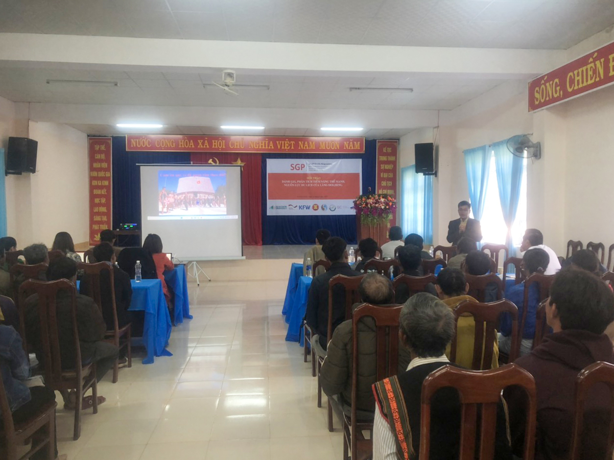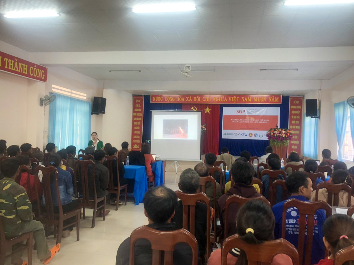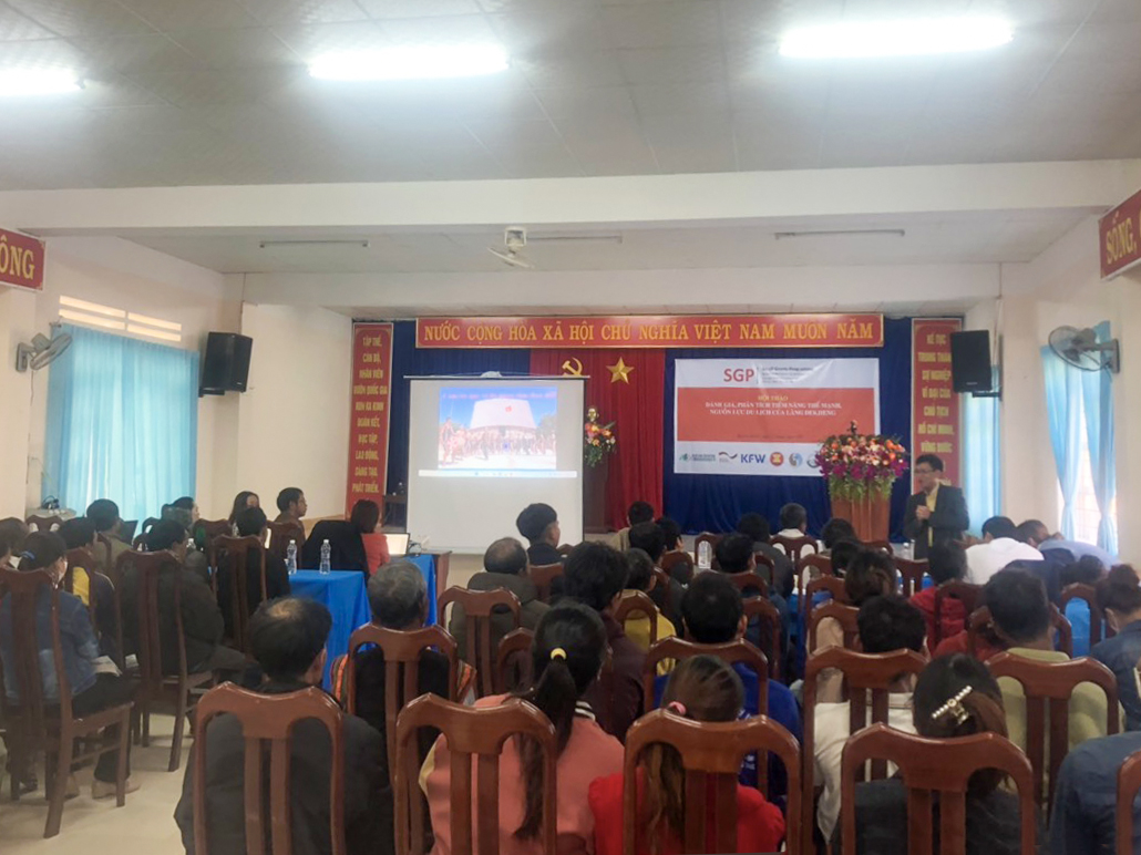 Participants in the conference were Mr. Ha Van Hung – Assistant Chief Technical Advisor of SGP II, Mr. Dinh Tien Tai – Representative of the Institute of Resources and Environment, Mr. Ngo Van Thang – Acting director of Kon Ka Kinh National Park, Representative of the Department of Culture, Sports and Tourism, Representative of Mang Yang District People’s Committee, Representative of Culture Department of Mang Yang District, Director of A Ngui Tourism Service Unit, and 80 local people in De Kjieng village.